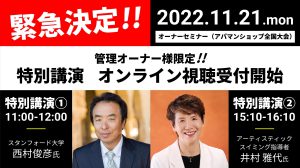 2022年11月21日(月)アパマンショップ全国大会にて行われる特別講演を、オーナー様限定で公開することとなりました。人材育成とリーダーシップに焦点を当てたオンライン講演で、ご参考にしていただける部分も多いのではないかと存じます。